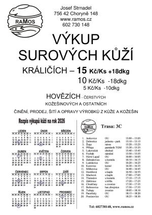 Soukromá firma ROKUP bude ve středu 28. ledna 2026 prodávat u obchodu od 10.45 hodin krmiva s vitamíny pro slepice i králíky, cena 350 Kč za 25 kg, a vitamínové doplňky pro slepice. Také budou vykupovat králičí kůže, cena 15 Kč za 1 kus.