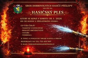 SDH Přílepy zve na Hasičský ples již tuto sobotu 10. ledna 2026 od 20 hodin. K dispozici poslední volné lístky. Lístky pouze v předprodeji. Rezervace na telefonu 723 433 505 u pana místostarosty.