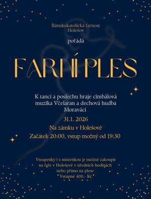 Římskokatolická farnost Holešov zve na Farní ples v sobotu 31. ledna 2026 od 20 hodin na zámku v Holešově. K tanci a poslechu bude hrát cimbálová muzika Včelaran a dechová hudba Moraváci. Vstupenky je možné zakoupit na faře v Holešově v úředních hodinách nebo přímo na plese. Vstupné 400 Kč.