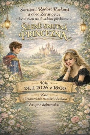 Sdružení Radost Racková a obec Žeranovice zvou na divadelní představení Šíleně smutná princezna, které se uskuteční v sobotu 24. ledna 2026 od 18 hodin v Žeranovicích na sále U Sedlářů. Vstupné dobrovolné.