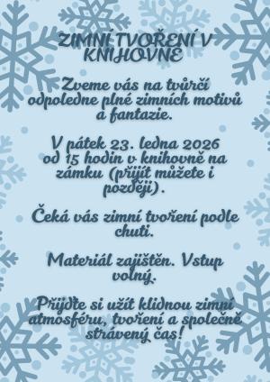 Knihovna Přílepy zve děti, rodiče i prarodiče na zimní tvoření. Tvůrčí odpoledne plné zimních motivů a fantazie proběhne v pátek 23. ledna 2026 od 15 hodin v knihovně na zámku. Materiál zajištěn. Vstup volný.