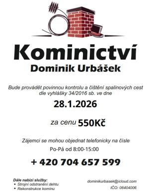 Kominictví Urbášek bude provádět kontrolu a čištění komínů a spalinových cest, a to ve středu 28. ledna 2026. Cena 550 Kč. Zájemci se mohou objednat na telefonním čísle 704 657 599 (pondělí–pátek, 8–15 h). Po domluvě je možné provést i frézování, vložkování a výstavbu nových komínových těles.