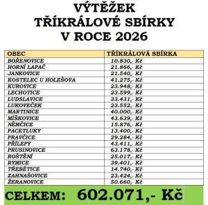 Mikroregion Holešovsko informuje: Letos se v našich obcích vybralo v rámci Tříkrálové sbírky celkem 602 071 Kč, v minulém roce se vybralo 570 190 Kč (po odečtení Holešova a jeho katastrálních území), tedy o 31 881 Kč více. Děkujeme.