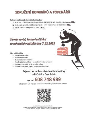 Sdružení kominíků a topenářů bude provádět v naší obci v neděli dne 7. prosince 2025