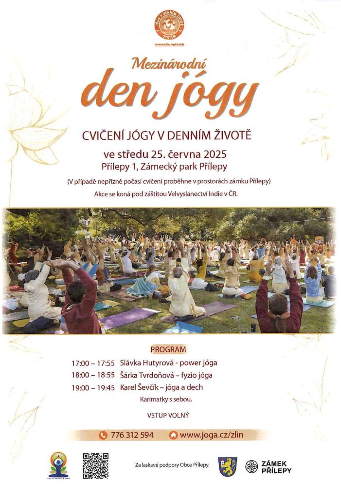 středa 25. června 2025 - zámecký park Přílepy - cvičení jógy v denním životě Karimatky s sebou Vstup volný www.joga.cz/zlin
