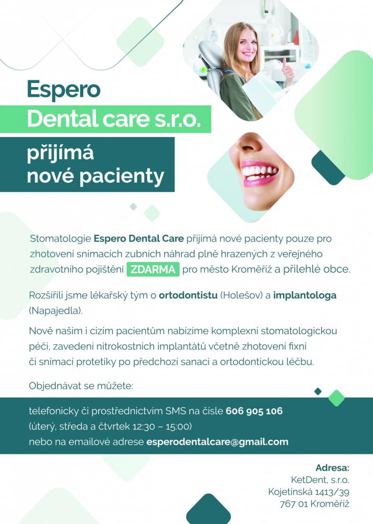 Stomatologie Espero Dental Care přijímá nové pacienty pro zhotovení snímacích zubních náhrad plně hrazených ze zdravotního pojištění a dále registruje bezzubé pacienty pro potřeby oprav stávajících zubních náhrad v ordinacích Otrokovice, Kroměříž a Napajedla. Objednat se můžete na tel. 606 905 106..