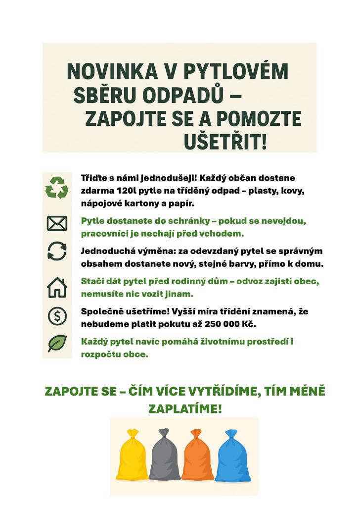 💰 Společně ušetříme! Vyšší míra třídění znamená, že nebudeme platit pokutu až 250 000 Kč.🌍 Každý pytel navíc pomáhá životnímu prostředí i rozpočtu obce.