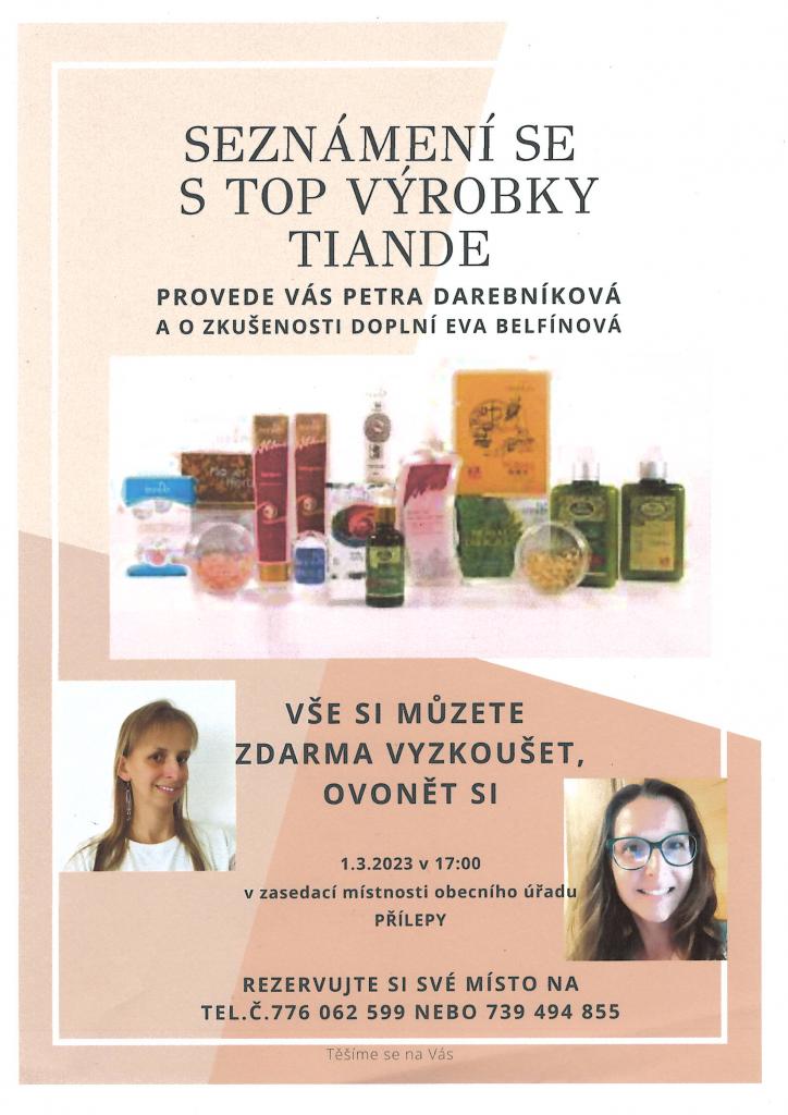 Zveme všechny zájemce na seznámení se s top výrobky Tiande, 1. 3. 2023 v 17.00 hod. v zasedací místnosti OÚ Přílepy. Výrobky si můžete zdarma vyzkoušet a ovonět. Srdečně zvou pořadatelky.