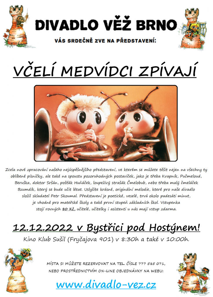 Včelí medvídci zpívají 12. 12. 2022 v Bystřici pod Hostýnem Objednávky a rezervace: tel. 777 585 071, www.divadlo-vez.cz