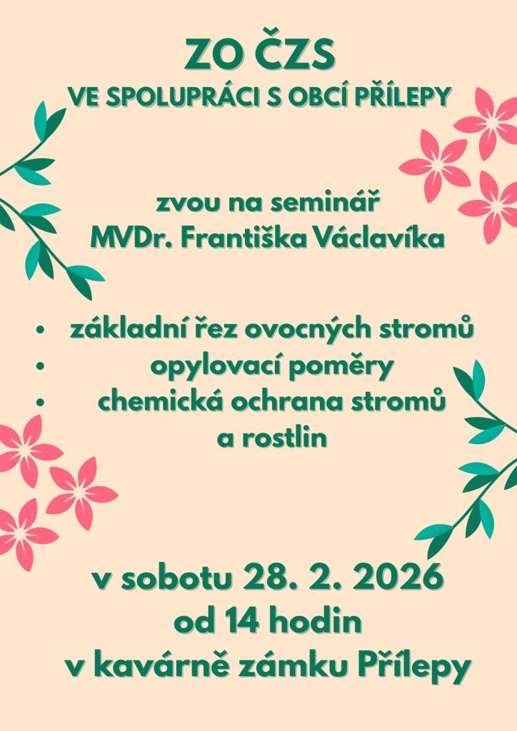 Základní organizace Českého zahrádkářského svazu Přílepy ve spolupráci s obcí Přílepy zvou na seminář MVDr. Františka Václavíka, který se bude konat v sobotu 28. února 2026 od 14 hodin v kavárně zámku Přílepy. Na semináři se dozvíte informace ohledně základního řezu ovocných stromů, opylovacích poměrů a chemické ochraně stromů a rostlin. Vstup volný.