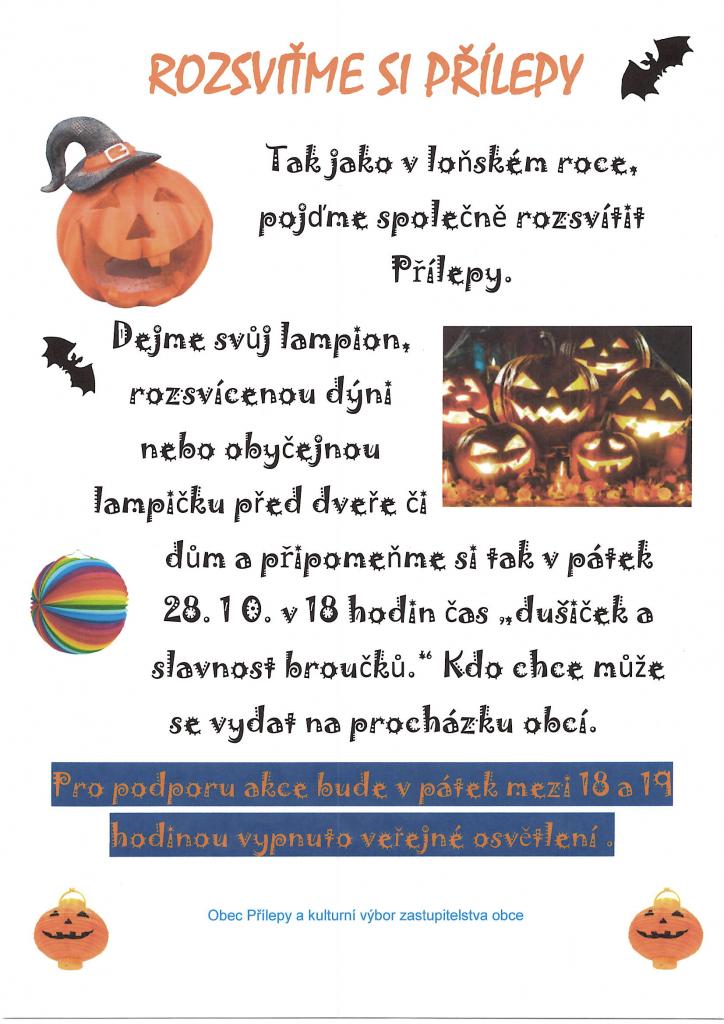 Tak jako v loňském roce, pojďme společně rozsvítit Přílepy. Dejme svůj lampion, rozsvícenou dýni nebo obyčejnou lampičku před dveře či dům a připomeňme si tak v pátek 28. října 2022 v 18.00 hod. čas Dušiček a Slavnost broučků. Kdo chce, může se vydat na procházku obcí. Pro podporu akce bude ...